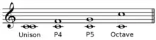 Within a diatonic scale[lower-alpha 2] all unisons (P1) and octaves (P8) are perfect. Most fourths and fifths are also perfect (P4 and P5), with five and seven semitones respectively. One occurrence of a fourth is augmented (A4) and one fifth is diminished (d5), both spanning six semitones. For instance, in a C-major scale, the A4 is between F and B, and the d5 is between B and F (see table).