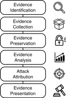 An IoT forensics investigation process should be conducted using the standard guidelines so that the collected evidence can be admissible on the court.[4] The process is analogous to digital forensics process, but faces challenges caused by the peculiarities of the IoT devices. The full process can be split temporally into six different phases: Evidence Identification, Evidence Collection, Evidence Preservation, Evidence Analysis, Attack and Deficit attribution, Evidence Presentation.[6] Each of the different phases of the forensic process may introduce several challenges when applied to the limitations of the IoT devices.[1]