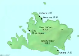 The island has an area of 289.27 km2 (111.69 sq mi) and a 2005 population of 2,347. The island does not have an airstrip, and most visitors—over 390,000 in 2006—arrive from Ishigaki by ferry, a 31.4 km (19.5 mi) ride to Uwahara Port (上原港) on Iriomote's northeast coast or Ōhara Port (大原港) on the southeast coast. Administratively, the island belongs to Taketomi Town, Okinawa Prefecture.[1] Its infrastructure is limited to a single coastal road connecting the hamlets on the northern and eastern shores.