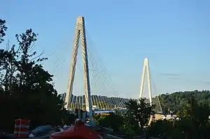 The bridge was redesigned as a two tower cable-stayed bridge, was reduced from three lanes to two and does not have a dedicated pedestrian walkway. Construction on the replacement span began in March 2012. Unlike the original bridge, which connects downtown Ironton with downtown Russell, the new bridge connects downtown Ironton directly with U.S. 23 and KY 244 within the city limits of Russell just south of downtown.[4][5]