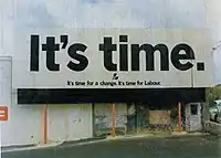 The "It's Time" campaign was used for television, radio, newspapers and billboards. It promoted on a growing need for political and economic change after 12 years of National Party government. In an economic recession and rising unemployment, National was lagging in polls. Labour's accompanying slogan was "Time For A Change, Time For Labour", expertly captured the nation's mood.[3] Claire Robinson, a Professor of Communications Design at Massey University, stated it was New Zealand's best election slogan "It had so many meanings – it's time for Labour, it's time for Norman Kirk, it's time for a change ... It was really good, and it was actually one of the best campaigns [too]. Mind you, we'd [New Zealand] had four terms of a National Government by then, so it was definitely time for a change."[4]