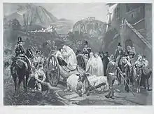 After Italian Brigands Surprised by Papal Troops, Vernet made a third painting on the subject of brigands, Confession of an Italian Bandit, in 1834. It was destroyed in the sacking of the Château de Neuilly during the Revolution of 1848.[7] The painting, which was reproduced several times, showed a dying bandit lying on an ox-driven cart receiving absolution by a monk kneeling by his side. The background landscape largely depicts neo-classical motifs like temple ruins and the arches of a Roman aqueduct.[8] The capture of the repentance of the bandit and his absolution closes Vernet's trilogy of brigand paintings (that is, Route de Naples, Italian Brigands Surprised by Papal Troops, and Confession of an Italian Bandit).