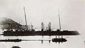 Affondatore sank in a storm in Ancona harbour on 6 August 1866,[2] which may have been due to damage received during the Battle of Lissa.[16] According to naval historians Greene and Massignani, however, Affondatore merely took on too much water due to her low freeboard; the damage sustained at Lissa had nothing to do with her sinking.[17] The contemporary French journal La Revue Maritime et Coloniale instead states that it was fault installation of the ship's hatches that allowed water to enter the ship in bad weather.[18] She had been refloated by 5 November.[19] After refloating, Affondatore was rebuilt at La Spezia from 1867 to 1873. The ship's masts and sails were removed, with a single mast carrying a fighting top fitted in their place.[2] In 1883–1885, she was fitted with new boilers and engines, rated at 3,240 indicated horsepower (2,420 kW),[2] and giving a speed of 13 knots (24 km/h; 15 mph).[20] During the annual fleet maneuvers held in 1885, Affondatore served in the 2nd Division of the "Western Squadron"; she was joined by the ironclad Roma and five torpedo boats. The "Western Squadron" attacked the defending "Eastern Squadron", simulating a Franco-Italian conflict, with operations conducted off Sardinia.[21]