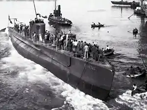In the early morning of October 18, while on the surface, captain Acanfora learned that the submarine had developed an oil leak, and ordered the crew to fix the problem as quickly as possible. A few hours later, with the sun out, and the crew sure that the leak had been repaired, Durbo submerged to about 100 feet (30 m).[3] At 17:25 a Saro London flying boat of 202 Squadron RAF, piloted by Captain Percy R. Hatfield, sighted air bubbles and a small patch of oil while flying off the island of Alboran, 65 miles East of the Strait of Gibraltar. Durbo just detected a ship, and rose up to periscope depth to observe her potential target. Around 17:50 together with a second 202 Squadron London, piloted by Captain Norman F. Eagleton, Hatfield dropped bombs at the location of the bubbles and the oil. The bombs dropped by the aircraft exploded but had not damaged Durbo, but forced the submarine to dive down to 100 feet (30 m) to avoid further attacks by the aircraft. The ship detected by Durbo was one of the British destroyers, HMS Firedrake or HMS Wrestler, patrolling nearby. After a lookout on HMS Firedrake had observed the reconnaissance planes dive and release bombs, both ships rushed in to close in on the area of attack, and soon established a contact on ASDIC. Durbo dove down to about 200 feet (61 m) trying to break off the attackers, and then submerged even deeper, to 400 feet (120 m). The pressure strained the steel plates which increased oil leak, making the submarine's position even more visible to destroyers. The depth charges set at 350 feet (110 m) were dropped, resulting in a large air bubble rising to the surface, possibly damaging the submarine's air supply system. After another attack, the submarine rose rapidly to the surface and was fired upon by HMS Wrestler. The submarine dove down, and another depth charge attack followed. After about 50 depth charges were dropped by both destroyers, at around 19:30, the submarine surfaced again, and was immediately fired upon by both destroyers. One shell hit the conning tower, forcing the crew to start abandoning the boat.[4][5][6]