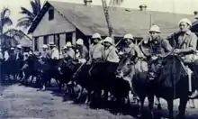 Wettengel served as Naval Governor of Guam from July 7, 1920, to February 27, 1921.[13] He overturned many of the policies of William Gilmer, the widely criticized and dislike governor immediately prior to him.[14] During his tenure, the Navy opened the first naval aviation station on the island at Orote Peninsula.[15] He attempted a military experiment during his time in office by forming the Guam Cavalry. These units rode mounted bulls but the idea was abandoned when the bulls proved untrainable.[16] He endorsed increasing medical aid to the island in an effort to in improving the "civilizing and Americanization" of the Chamorro people by making health care and sanitation more widespread.[17]