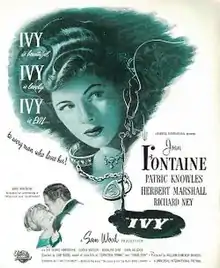 Ivy is a 1947 American crime drama film directed by Sam Wood and starring Joan Fontaine, Patric Knowles, Herbert Marshall and Richard Ney. It written by Charles Bennett, based on the 1927 novel The Story of Ivy by Marie Adelaide Belloc Lowndes. It was distributed by Universal Pictures.[1] The film was entered into the 1947 Cannes Film Festival.[2]