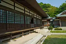 After the main gate (sanmon) in the middle of the temple's large garden stands the Main Hall (the Hon-dō, see photo above). Its structure is however not that of a typical Zen Butsuden, but rather that of an 8×6 bay (, ken) hōjō (chief priest's living quarters) with raised floors.[2] Destroyed by fire in 1748, it was rebuilt in 1754 using in part original Muromachi period timber salvaged from the old edifice.[2] The main object of worship is a seated figure of Shaka Nyorai carved in wood during the Nanboku-chō period.[2] The temple also owns a seated figure of founding priest Taikō Gyōyū (the temple's only Important Cultural Property), a statue of goddess Shō-Kannon, another of Fujiwara no Kamatari (an ancestor of the Fujiwara clan), and one of Kōjin, the god of the kitchen and cooking.[2] The hōkyōintō in the cemetery behind the Hon-dō is said to be Ashikaga Sadauji's grave, but the attribution has been questioned by scholars because of the date it bears, sixty years after Sadauji's recorded date of death.[2] The temple includes a recently restored tea house called Kisen-an (喜泉庵) where monks used to meet to have tea, but which is now open to the public. In front of the tea house lies a karesansui, or Zen rock garden. On the premises there is also a restaurant and bakery owned and operated by the temple itself. Near the temple can be found the ruins of Daikyū-ji (大休寺), Ashikaga Tadayoshi's family temple (he was often called Daikyū-dono (大休殿)) where he was buried after he died.