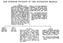 His sons Joshua and Isaac, died in infancy. His daughter Deborah (born 1564 – died unknown) married twice, first to Walter Dunch (circa 1552 – 4 June 1594), of Avebury Manor in Wiltshire, M.P. for Dunwich, then she married Sir James Mervyn, of Fonthill Gifford also in Wiltshire, M.P. for that county. His younger daughter Ruth (died 1627) became the second wife of Sir Henry Harrington of Bagshaw and Baltinglass in 1587, they had a son, Henry. Henry's only daughter to survive into adulthood, Morag Harrington (Died 1669), married James Pilkington's own great nephew, Charles Tynewood Pilkington (died 1689).[8]