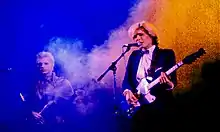 The band was initially nameless until the members opted to call themselves Japan. This name was intended by Sylvian to be temporary until they could think of something else, but ultimately became permanent.[8] The following year they were joined by another school friend Richard Barbieri on keyboards and later by lead guitarist Rob Dean, and signed a management deal with Simon Napier-Bell (who also managed the Yardbirds, Marc Bolan, London and Wham!) in 1976. After coming runner up to The Cure in a talent contest staged by Hansa Records[9] the band signed a recording contract with Hansa-Ariola in 1977, becoming an alternative glam rock outfit in the mould of Lou Reed, David Bowie, T.Rex, Roxy Music, and New York Dolls although their initial material was guitar-based funk.[10]