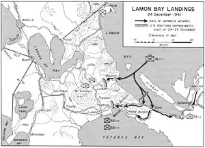 The Japanese Invasion of Lamon Bay (Filipino: Paglusob ng mga Hapones sa Look ng Lamon) was a secondary mission in the Japanese invasion of Lingayen Gulf during the 1941-1942 Japanese conquest of the Philippines. Securing the coast southeast of Manila would complete the Japanese encirclement of the capital and would act as a diversionary attack from the Japanese main invasion force from the north.[1]
