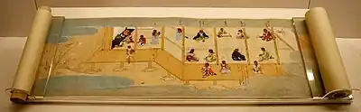 Historian and author Haga Kōshirō points out that it is clear from the teachings of Sen no Rikyū recorded in the Nanpō roku that the suitability of any particular scroll for a tea gathering depends not only on the subject of the writing itself but also on the virtue of the writer. Haga points out that Rikyū preferred to hang bokuseki ("ink traces"), the calligraphy of Zen Buddhist priests, in the tea room.[22] A typical example of a hanging scroll in a tea room might have the kanji wa-kei-sei-jaku (和敬清寂, "harmony", "respect", "purity" and "tranquility"), expressing the four key principles of the Way of Tea. Some contain only a single character; in summer, kaze (風, "wind") would be appropriate. Hanging scrolls that feature a painting instead of calligraphy, or a combination of both, are also used. Scrolls are sometimes placed in the waiting room as well.