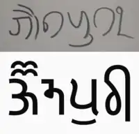 ![]() jaunapurī written in Sirmauri-Jaunsari Takri (above) & Takri Scripts. | |