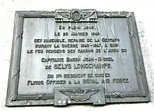 Upon his return, Longchamps was reprimanded for acting without orders and demoted to pilot officer. However, he was soon after awarded the Distinguished Flying Cross for his actions.[4][5] Some resistance sources claimed a death toll as high as thirty, while the Nazis admitted four fatalities and five serious injuries.[6][1] A bust near the site commemorates Longchamps' actions.[7][8]