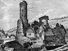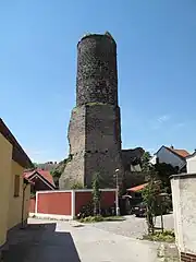 An unusual oval shape excelled in the castle's layout and the 28-meter-high tower is the first visible part of the castle. A castle core has a triangular shape.The oldest building structure is located only in a sub-part of Bergfried and the adjacent part of the wall, which is lined with smaller stones. Three palace wings surrounded the small courtyard. The north disappeared almost without a trace, because the rock below was largely excavated. From the front palace on the east side stood a part of the courtyard wall with arched entrance to the basement. A small fragment of the portal lining in the same wall illustrates the height of the original entrance. The courtyard and parts of the side walls have been preserved from the third palace.[5] The dominant feature of the preserved part of the castle is a 28-meter-high round tower on which are three coats of arms of the owners carved from sandstone are placed at the entrance. On the second floor of the tower is a chapel on a circular ground plan. A wooden spiral staircase leads through the tower. Remains of the circumferential walls of the former palace are preserved in the courtyard. The tower was raised by Jan of Jenštejn, which can be seen in follow-up of narrower upper part to the wider lower one. This was used as a walkway for guards, later it was converted to a covered gallery.[4] The original entrance was on the first floor after a drawbridge, but later a new one was created on the ground floor. The tower was covered with a stone helmet with four dormers, the remains of the roofing can be seen on the old engravings (still visible on 19th century engravings).[4]