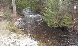 The creek begins at an unnamed pond adjacent to the old Ferguson Highway and heads westward for 0.67 km (0.42 mi) where it flows under Highway 11. It then flows an additional 0.16 km (0.099 mi) to the northwest where it enters the northeastern end of Jessie Lake.[1] The creek continues to flow northwards from the west end of Jessie Lake for 1.1 km (0.68 mi), crossing Strathcona Road then emptying into Inlet Bay of Lake Temagami.[1][2]