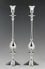 The menorah (or hanukkiah) used on the Jewish holiday of Hanukkah is perhaps the most widely produced article of Jewish ceremonial art.[3][4][5] The Lindo lamp is a particularly fine example by an 18th-century silversmith. Contemporary artists often design menorahs, such as the gold-plated brass menorah with 35 moveable branches designed by Yaacov Agam.[6] A silver menorah by Ze'ev Raban from the 1930s is in the Judaica Collection of the North Carolina Museum of Art.[7]