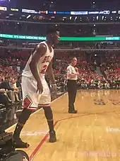 On July 9, 2015, Butler re-signed with the Bulls to a five-year, $95 million contract. The deal included a player option for the fifth year.[26][27] On December 9, he scored a then career-high 36 points in a loss to the Boston Celtics.[28] He topped that mark with 43 points on December 18 in a 147–144 quadruple overtime loss to the Detroit Pistons.[29] On January 3, Butler broke Michael Jordan's team record for points in a half, scoring 40 of his 42 after the break to lead the Bulls to a 115–113 win over the Toronto Raptors.[30] Two days later, he recorded 32 points and a then season-high 10 assists in a 117–106 win over the Milwaukee Bucks.[31] On January 14, he scored a career-high 53 points in a 115–111 overtime win over the Philadelphia 76ers. Butler also had 10 rebounds and six assists while making 15-of-30 field goals and 21-of-25 free throws to help the Bulls snap a three-game losing streak. He became the first Bulls player to score 50 points since Jamal Crawford in 2004.[32] On February 5, Butler suffered a left knee strain in a game against the Denver Nuggets[33] and missed nearly four weeks.[34] He was voted to play in the 2016 NBA All-Star Game, but the injury forced him to drop out, and he was subsequently replaced in the East team by teammate Pau Gasol.[35] Butler missed 11 games with the knee injury, returning to action for the Bulls on March 5 against the Houston Rockets. In 34 minutes of action, he recorded 24 points, 11 rebounds, 6 assists and 1 steal in a 108–100 win, helping the Bulls snap a four-game losing streak.[36] However, he returned to the sidelines on March 7 for the team's game against the Milwaukee Bucks due to back soreness and swelling in his left knee.[37] After a three-game absence, he returned to action on March 14 against the Toronto Raptors.[38] On April 2, he recorded his first career triple-double with 28 points and career highs of 17 rebounds and 12 assists in a 94–90 loss to the Detroit Pistons.[39] In the Bulls' season finale on April 13, Butler recorded his second career triple-double with 10 points, 12 rebounds and 10 assists in a 115–105 win over the Philadelphia 76ers.[40]