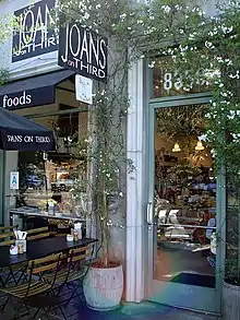 In 1998 Joan's expanded into an adjacent storefront on Third Street, helping to realize Ms. MacNamara's "lifelong dream of opening a gourmet foods marketplace and café."[5] Another major expansion took place in 2007 that helped expand the scope of the company's operations by tripling the floor space of the market.[6][7] Beside being a market, Joan's is also a full-service restaurant providing table service and take-out meals for it patrons.[1] Often very busy, Joan's has been described as being reminiscent of some famous New York restaurants, including Zabar's, Dean & DeLuca, and Fairway Market.[1][5][7]