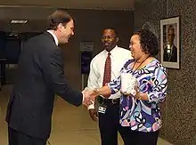 Berry was appointed Assistant Secretary for Policy, Management and Budget at the U.S. Department of the Interior during the Clinton administration, serving from 1997 to 2001.[2][7] At the Interior Department, Berry improved credit union and continuing education options, oversaw the expansion of department programs to improve employees' work-life balance, and held town hall meetings with Interior employees and used their suggestions to upgrade a cafeteria and health center.[9] These changes were partly funded through partnerships with federal employees, unions and other agencies to reduce costs for the department.[9] Berry worked to create a complaint procedure for employees who experience discrimination because of their sexual orientation, to expand relocation benefits and counseling services to domestic partners of employees, to establish a liaison to gay and lesbian workers, and to eliminate discriminatory provisions of the National Park Service's law enforcement standards.[11] He helped establish an office supply store for Interior employees, which he staffed with disabled workers.[9] Berry oversaw one of the largest budgetary increases in the department's history.[10]
