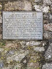 A memorial plaque at Zennor church was erected by the St Ives Old Cornwall Society. The inscription describes Davey as "the last to possess any traditional considerable knowledge of the Cornish Language", and contains a Cornish quotation from the Book of Proverbs: "The words of wise men are as a deep pool, a flowing stream – a fountain of life".