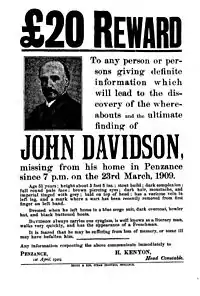In 1906 he was awarded a civil list pension of £100 per annum and George Bernard Shaw did what he could to help him financially, but poverty, ill-health, and his declining powers, exacerbated by the onset of cancer, caused profound hopelessness and clinical depression.[7] Late in 1908, Davidson left London to reside at Penzance. On 23 March 1909, he disappeared from his house there, under circumstances which left little doubt that he had drowned himself. Among his papers was found the manuscript of a new work, Fleet Street Poems, with a letter containing the words, "This will be my last book." His body, which was discovered by some fishermen in Mount's Bay on 18 September, was, in accordance with his known wishes, buried at sea. In his will he desired that no biography should be written, none of his unpublished works published, and "no word except of my writing is ever to appear in any book of mine as long as the copyright endures."[1]