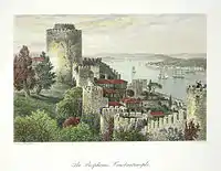 For Appleton's Picturesque Europe series, Woodward was sent to northern and eastern Europe. His work did not appear in the first volume of the series, which dealt with the British Isles. In the second and third volumes, his drawings and paintings illustrated the sections on "Old German Towns",[25] "Norway", "Norway (The Sogne Fjord, Nord Fjord, Romsdal)", "Sweden", "Dresden and the Saxon Switzerland", "Constantinople", "Russia", and "The Danube".[26] His Romsdalhorn and Bosphorus, Constantinople, were the basis for two of their steel engravings.[26]
