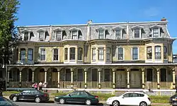 Built between 1875 and 1876, these historic structures are made of brick, and have green serpentine facing. Designed in the Second Empire style, they feature wooden first-floor porches, projecting bay windows, and mansard roofs with dormers.[2]