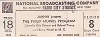 Ticket for the Philip Morris Program radio show, 1945, presented by "Johnny"