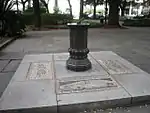 Dedicated to Colonel William Bull, the namesake of Savannah's Bull Street. Bull was a South Carolinian who assisted Oglethorpe with the establishment of Savannah and, as a surveyor, laid out the original street grid. The sundial has four panels, one on each side of its square granite base. The dial itself is bronze, set atop a marble shaft. One of the base panels reproduces a 1734 map of Savannah.[2] |