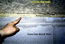 Perimeter slab edge building joint with incomplete firestop, between concrete floor and precast concrete facade.