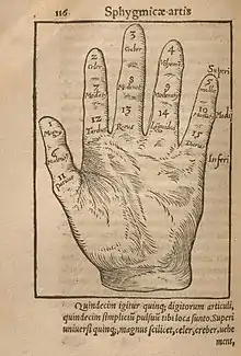 His conceptual approach to measurement of the pulse is regarded as pioneering and revolutionary.[2][3] In Sphygmicae artis iam mille ducentos annos perditae et desideratae libri V. (first published 1540 in Basel, but only copies from 1555 are accessible) he described five types of pulses, the diagnostic meaning of those types, and the influence of body temperature and nervous system on pulse. As a memory aid he used the palm and fingers to the types of pulse. It contains probably the earliest graphic presentation of the pulse, making use of musical notes for long, breve, and semibreve.[4][1] He also noted that the pulse could be used to detect lies and reactions of people.[1] This was one of books used by William Harvey in his works.