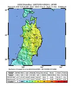 The July 2008 Iwate earthquake (岩手県沿岸北部地震, Iwate-ken Engan Hokubu Jishin) was an earthquake that occurred in Iwate Prefecture, Japan on July 23, 2008. The earthquake's moment magnitude was 6.8 and it occurred at a depth of 115 km. Since this earthquake was an intermediate-focus earthquake, the shaking of the earthquake was observed over a wide range.[5] It had a maximum JMA intensity of Shindo 6− (Aomori and Iwate).[3]