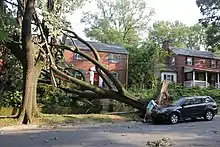 Damage was widespread and extensive along the entire path of the derecho, especially in northern Indiana and the Fort Wayne metro area, central and western Ohio, northeastern Kentucky, southwestern Pennsylvania, West Virginia, northern, central, and southwestern Virginia,[15] Maryland, Washington, D.C., Delaware and southern New Jersey. In all the mentioned areas, many trees uprooted or snapped, roofs became damaged, tents deployed to sell fireworks leading up to the 4th of July Holiday collapsed, and power outages were extensive, with over 4.2 million customers losing power as a result.[16] [17] An Appalachian Power representative described the power outage as the worst the company had ever seen.[15] In total, 22 people were killed across seven states and the District of Columbia.[18] At least ten of those deaths were in Virginia, all of them due to fallen trees.[15] Two of the deaths were in New Jersey, after two children were killed by falling trees at a campground at Parvin State Park, three deaths were reported in Maryland and one death was reported in Ohio after the storm.[19] As it occurred in the midst of the record Summer 2012 North American heat wave, conditions on following days were problematic, particularly for seniors and vulnerable people. Scattered structural damage also occurred along the path of the derecho, from both falling trees and the winds themselves. Some of the damage included siding was torn off houses, roofs removed from houses, businesses and apartment buildings, mobile homes heavily damaged, barns and garages destroyed and airplanes flipped.[7]