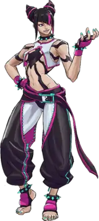 Juri's shirt was modeled after a spider, and left the sides of her breasts exposed at Ono's suggestion. Her pants were designed to give a "silhouette that looks like a Taekwondo uniform." The black trim on her pants was added to set her apart from other Street Fighter characters who wear similar uniforms.[3] Her colour scheme was originally plain. However, when lined up with other characters, she didn't stand out; as a result, they employed hot pink, a colour not used in any other female character in the game. They added black details to her outfit to make it less "frivolous."[3] A pink crystal, known as the Feng Shui Engine, was added as a replacement inside her left eye after deciding to align her with Seth, in order to more closely tie her character to the organization. The crystal was originally in her stomach, similar to Seth. Other ideas were considered, including having it in one of her palms, one of her legs, or one of her ankles. They eventually settled on putting it in her eye, with design director Kamei commenting that a "big globe in the stomach of a female character wasn't going to look very attractive." He also commented that an eye is a logical place to have an artificial replacement, as well as already being spherical.[3] Initially, Juri was designed to be chubbier and cuter. Gradually the design was made slimmer, though the team noted at some point they had realized they had overdone it and reversed the changes slightly. She was given full legs, and a slender upper body in order to show the contrast. Kamei wanted to make her even more slender, but decided that if she was too small, her kicks would lack impact.[3] Several designs were considered for her face, going through about seven versions before settling on her current appearance, though time constraints played a part in the decision.[3]