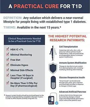 The organization defines a Practical Cure as any solution that gives people living with the disease the chance to live a normal, unrestricted life. The clinical requirements of a Practical Cure are defined by those living with T1D who understand the daily burden. Practical Cure requirements include testing blood sugars once a week or less, eating an unrestricted diet, a greatly reduced and simple regimen of medication, sleeping worry-free, experiencing minimal to no diabetes side effects, and experiencing fast recovery from surgeries.[2]