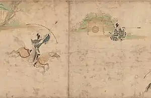 In battle, particularly around the time of the Heian period, kabura-ya would be shot before a battle, to alert the enemy. The whistling sound was also believed to chase away evil spirits, and to alert friendly kami to lend their support. It was not uncommon for archery exchanges to be performed for quite some time, and in the 1183 battle of Kurikara, for example, fifteen arrows were shot by each side, then thirty, then fifty, then one hundred, before these hundred samurai on each side actually engaged one another in battle.[2] It was also not uncommon for messages to be tied to these arrows, which could be shot into fortresses, battle camps or the like. This practice of the formal archery exchange likely died out gradually following the end of the Heian period, as war became less and less ritualized.