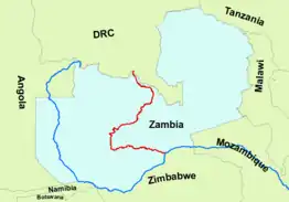 The Kafue River is the longest river lying wholly within Zambia at about 1,576 kilometres (979 mi) long.[1] Its water is used for irrigation and for hydroelectric power.[2] It is the largest tributary of the Zambezi,[3] and of Zambia's principal rivers, it is the most central and the most urban. More than 50% of Zambia's population live in the Kafue River Basin and of these around 65% are urban.[1]