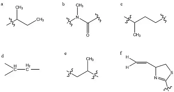 The structure of kalkitoxin was first determined by characterizing six partial structures which were subsequently connected to yield the total structure.[4] This investigation was largely carried out through various NMR experiments. Structure (a) is a sec-butyl group, indicated by characteristic deshielding of its central methine group due to the adjacent carbonyl. Structure (b) contains this carbonyl group, and an adjacent tertiary methylated nitrogen atom, constituting a tertiary amide group. Since this is a tertiary amide, it exists in a cis/trans mixture, which underlies the two conformations of kalkitoxin. Structure (c) is a string of two methylene groups, then a methine group bearing a high-field methyl group. The next two groups identified (d,e) are identical and opposing strings of CH2-CH-CH3, however the left grouping's methylene protons experience greater deshielding, due to their proximity to the adjacent imine. Deshielding is an effect of a nearby electronegative atom withdrawing electron density from a given atom nucleus, eliciting an increased chemical shift as measured by NMR.