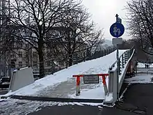 The Karlssteg is a 136.5 meter long footbridge of tension construction in Freiburg im Breisgau, Germany. A concrete strip only 25 cm thick with 60 continuous tension elements leads from Karlsplatz to the Stadtgarten. In high temperatures, the tension band can sag up to 40 cm. Construction of the bridge began in 1969; in January 1970, the columns were already standing, and in June, for the city's 850th anniversary, the Karlssteg Bridge – constructed by the engineer H.Nehse – was opened to traffic as the first bridge of its kind in Germany. In the same year, the Mozart, Hermann and Schwabentor bridges were opened, though in a less spectacular way, passing over Mozartstraße (Mozart Street) and Schlossbergring.
