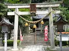The Ichihaya-no-mikoto god is worshipped here. His parents are the Inishiki-Irihiko-no-mikoto god (Inaba Shrine) and the Nunoshihime-no-mikoto goddess (Kogane Shrine).[1] Because of the relationship between their three gods, these three shrines have a very close relationship. As this shrine is built for the child of the two other gods, it is the smallest of the three shrines.