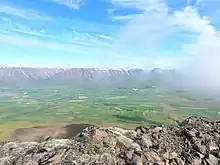 Mount Kerling (Icelandic pronunciation: [ˈcʰɛ(r)tliŋk] ⓘ, "Old Hag") is the highest mountain (1536 m) in the District of Eyjafjarðarsveit, in northern Iceland. It is only 13 km SSW of Akureyri. Its structure is mainly basaltic rock, but the uppermost part is rhyolite, which extends to Súlur mountain nearby and all the way around the head of the Glerárdalur valley to the lower slopes of Vindheimajökull [ˈvɪntˌheiːmaˌjœːkʏtl̥] on the western side of the valley.[3] It is considered an easy climb, with excellent panoramic views on a fine day.[4]