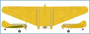 Its central wing panel was rectangular in plan, with a steel tube structure including four spars and dural skinning. It had a chord of 5.0 m (16 ft 5 in) and a chord/thickness ratio of 14%. The outer panels, 82% of the span, were all-wood structures with dihedral and sweep on the leading edge only, giving an overall sweep of 16° at quarter-chord;. They decreased in thickness outwards from 14% to 7%, with 8° washout. Each wing carried three control surfaces. Near each tip, close behind and parallel to the leading edge there was a large, rectangular plan interceptor. These were operated differentially by pedals which also controlled the rudder and were used to make flat turns. Inboard of the interceptors, each outer panel trailing edge carried two broad-chord control surfaces that acted as both ailerons and elevators.[1]