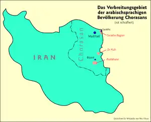 Khorasani Arabs are Iranian Arabs who are descended from the Arabs who immigrated to the Khorasan area of Iran during the Abbasid Caliphate (750−1258). Unlike the Arabs of Iran's Khuzestan Province in the southwestern part of the country, who are direct descendants of the ancient population of the area, the Khorasani Arabs are descended from actual Arab migrants.[1] According to a 2013 article in peer-reviewed journal Iran and the Caucasus, the Khorasani Arabs, numbering c. 50,000, are "already almost totally Persianised".[1]