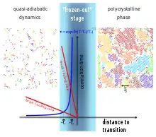 This time scale is often referred to as the freeze-out time. It is the intersection point of the blue and the red curve in the figure. The distance to the transition is on one hand side the time to reach the transition as function of cooling rate (red curve) and for linear cooling rates at the same time the difference of the control parameter to the critical point (blue curve). As the system approaches the critical point, it freezes as a result of the critical slowing down and falls out of equilibrium. Adiabaticity is lost around . Adiabaticity is restored in the broken-symmetry phase after . The correlation length at this time provides a length scale for coherent domains,
