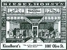 In 1879, Kieselhorst Jr. and Ernst P. Olhausen, who was then the assistant editor of the Westliche Post, opened Olhausen & Kieselhorst, a store that sold "pianos, organs, musical instruments, music, books, and stationary" at 10 South Fourth Street.[2] After six months, Kieselhorst bought out his partner, struck Olhausen's name from the business, and moved the shop to 2706 Laclede Avenue in the Mill Creek Valley neighborhood.[4] In 1881, he began selling Henry Miller Pianos, made in Boston. Three years later, he moved the business to 1111 Olive Street, in the city's growing piano district.[4] He sold pianos by William Knabe & Company (made in New York City), Kimball & Company (Chicago), and Blasius & Sons (Woodbury, New Jersey). By 1893, he was able to move the store to a more prominent space at the southwest comer of Olive and Tenth. Kieselhorst ran the company until 1895, when he died at age 51.[2]