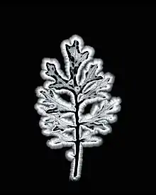 A typical demonstration used as evidence for the existence of these energy fields involved taking Kirlian photographs of a picked leaf at set intervals. The gradual withering of the leaf was thought to correspond with a decline in the strength of the aura. In some experiments, if a section of a leaf was torn away after the first photograph, a faint image of the missing section sometimes remains when a second photograph was taken. However, if the imaging surface is cleaned of contaminants and residual moisture before the second image is taken, then no image of the missing section will appear.[36][37][38]