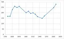 In 1801, Kirstead had a total population of 168 people. This rose and fell until 1951 where it recorded its lowest population of 149 people but since then, the population has increased to 279, as seen in the 2011 census.[6] According to the 2011 Census, the majority of the population are White British[7] with 66.3% being Christian. There are no other recorded religions, with the rest of the population having no religion (26.5%) or not stating (6%).[8]