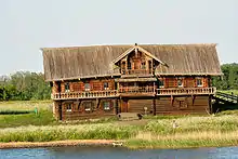 Open-air museum Kizhi is one of the first in Russia, which started functioning on the island in 1951 and currently contains about 87 wooden constructions. The most famous of them is the Kizhi Pogost, which contains two churches and a bell tower surrounded by a fence. The pogost was included in the UNESCO World Heritage list in 1990.[19] Since 1951, a large number of historical buildings were moved to the island. They include Church of the Resurrection of Lazarus from Murom Monastery, which is regarded as the oldest remaining wooden church in Russia (second half of the 14th century),[3] several bell towers, more than 20 peasant houses, mills, barns and saunas.[5] In 1993, the museum was included into a short list a Russian Cultural Heritage sites.[20] The museum contains more than 41,000 exhibits. Most of them are domestic artifacts: tools, dishes, utensils, furniture, etc. There are about 1000 icons of the 16th–19th centuries which includes Russia's only collection of "heavens". There are also church items, such as crosses early manuscript of 17th–19th centuries. The museum also contains exhibits of the 20th century, about 10,000 photographs and 1,500 drawings.[21]