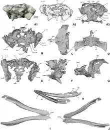 Forming the sides of the back of the skull is the exoccipital, which surrounds most of the foramen magnum. The Eustachian tube extends downwards across the basoccipital and basisphenoid; these bones are thickened on either side of the tube in K. langenbergensis. K. guimarotae has a small rounded foramen beside the tube on the basoccipital, and a tuberosity bearing a ridge above.[5] On the front of the basoccipital in both species, there are two rounded depressions near the bottom. The basisphenoid resembles a triangular hatchet in shape when viewed from the side.[3]