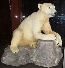 Knut's remains were exhibited in Berlin's Museum of Natural History, although this decision has caused some controversy with fans.[59][60] A full-sized sculpture covered in Knut's pelt was presented to the public on 16 February 2013. It went on display in the entrance hall of the museum where it was viewed free of charge until 5 May.[61] It will later be used for an exhibition on climate change and environment protection. Museum spokeswoman Gesine Steiner stated that "It's important to make clear we haven't had Knut stuffed. It is an artistically valuable sculpture with the original fur."[62]